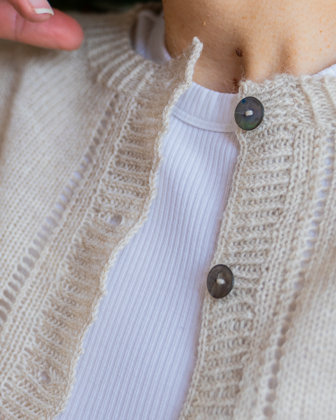 Le gilet Christelle, c’est la définition de l’élégance subtile. Avec son col rond classique et ses boutons discrets, il mise sur la simplicité, mais ce sont ses détails qui le rendent vraiment unique. Les manches arborent un magnifique motif ajouré qui apporte une touche de féminité et de légèreté à l’ensemble, tandis que des petites ouvertures discrètes soulignent la bordure, ajoutant encore plus de charme.
