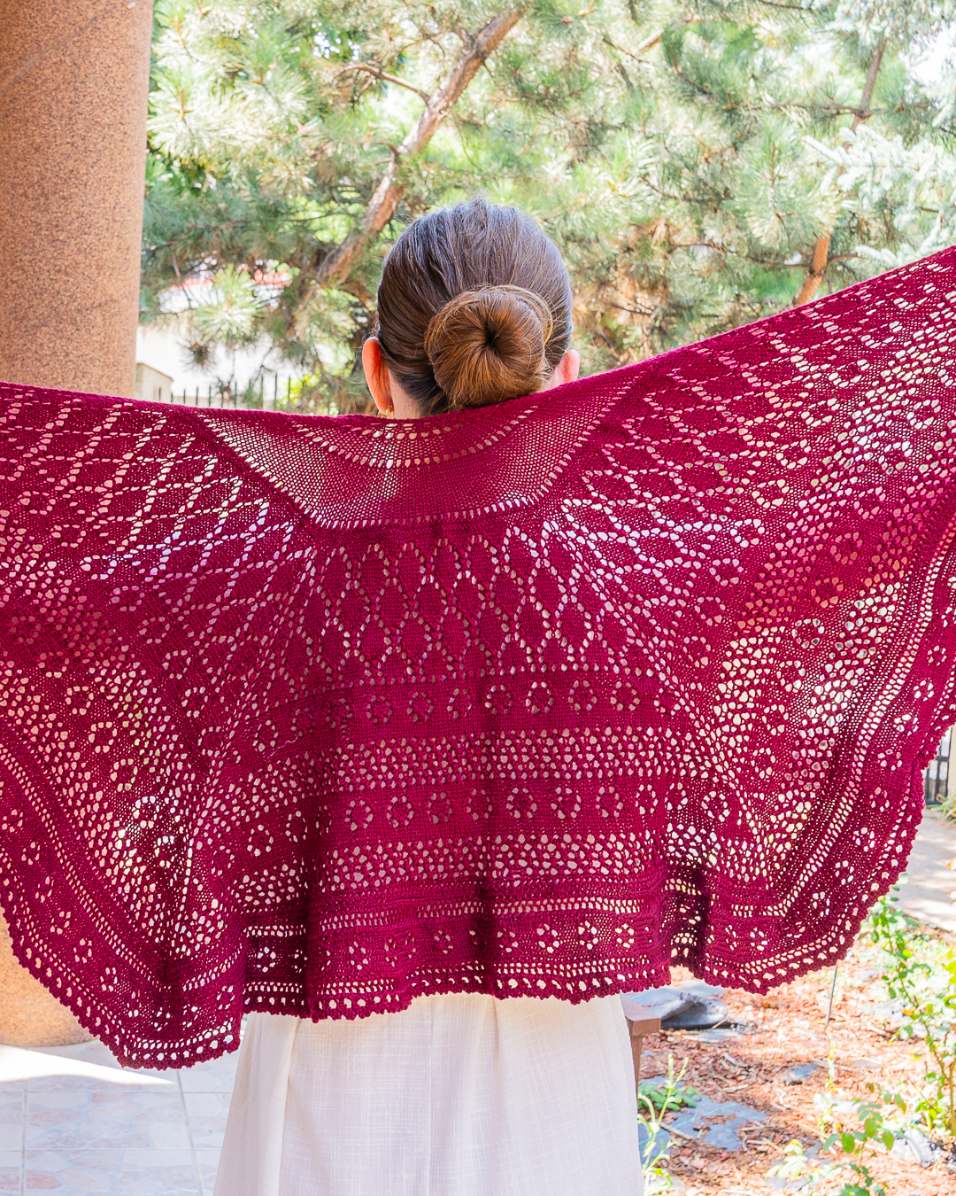 Le châle Clarisse est un sublime modèle avec un démarrage en châle demi-pi, puis divisé en trois sections triangles en rayon pour le poursuivre et le terminer.