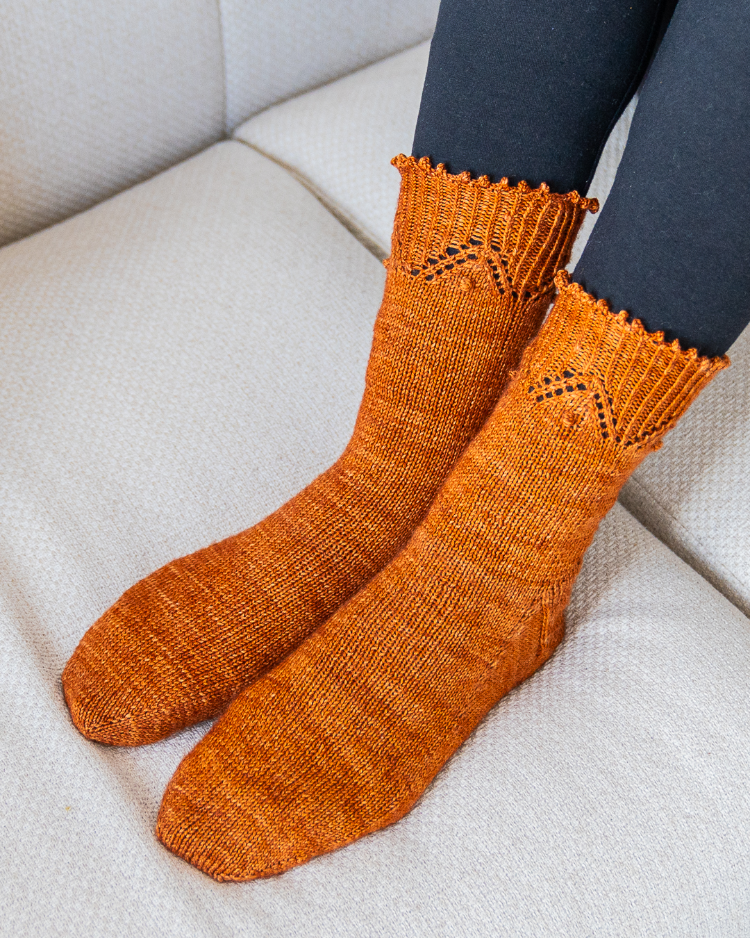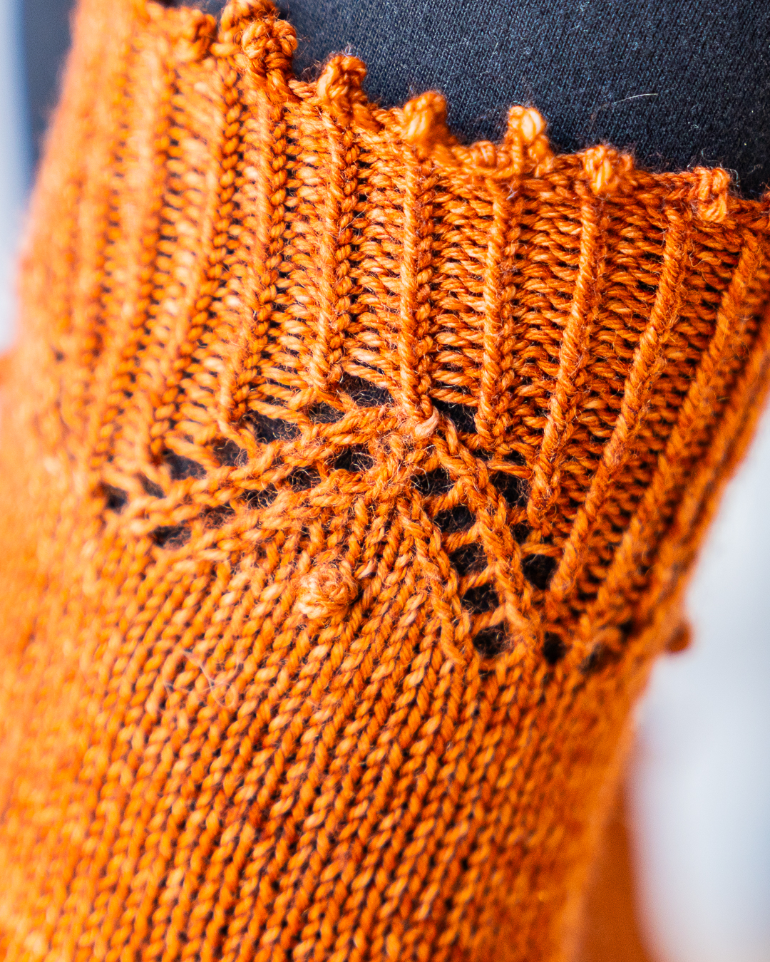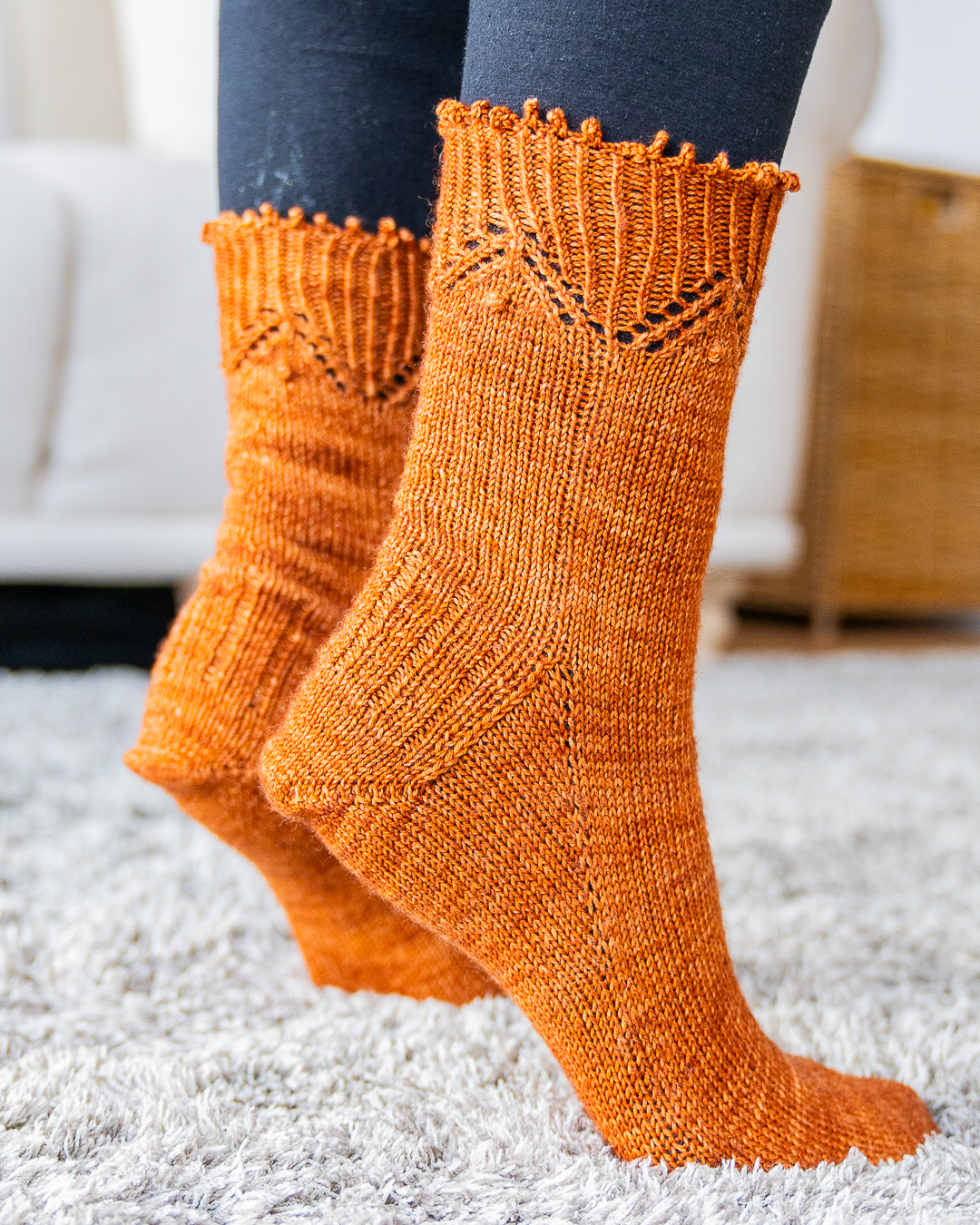 Les chaussettes Aleth sont des chaussettes simples, mais pas simplistes. Tricotées de la pointe vers la manchette tout en jersey à l’exception du début de la manchette qui se tricote avec un motif de mailles torses, dentelle et noppes, ce modèle est original et fun à tricoter tout en restant accessible et facilement portable.