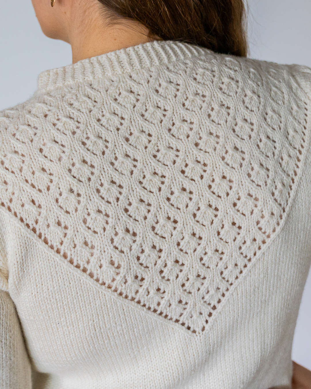 Le pull Brigitte est un magnifique pull avec un empiècement en dentelle que l’on retrouve sur le devant, le dos et les manches. Tricoté du bas vers le haut, ce pull féminin et élégant trouvera forcément sa place dans ta garde-robe.