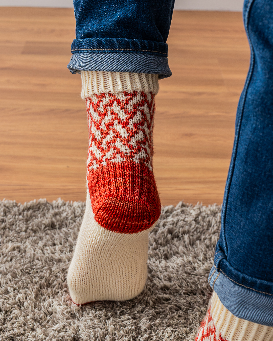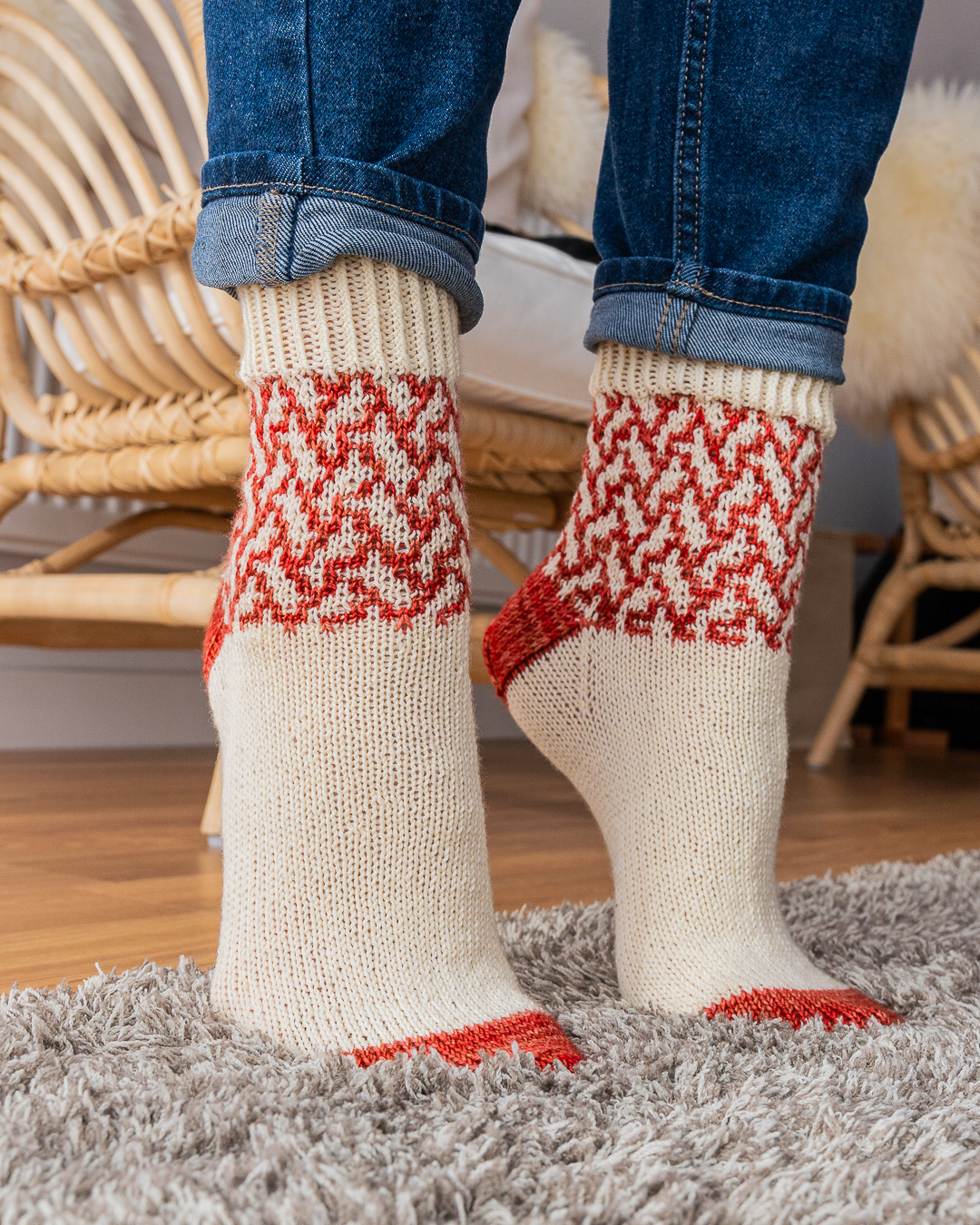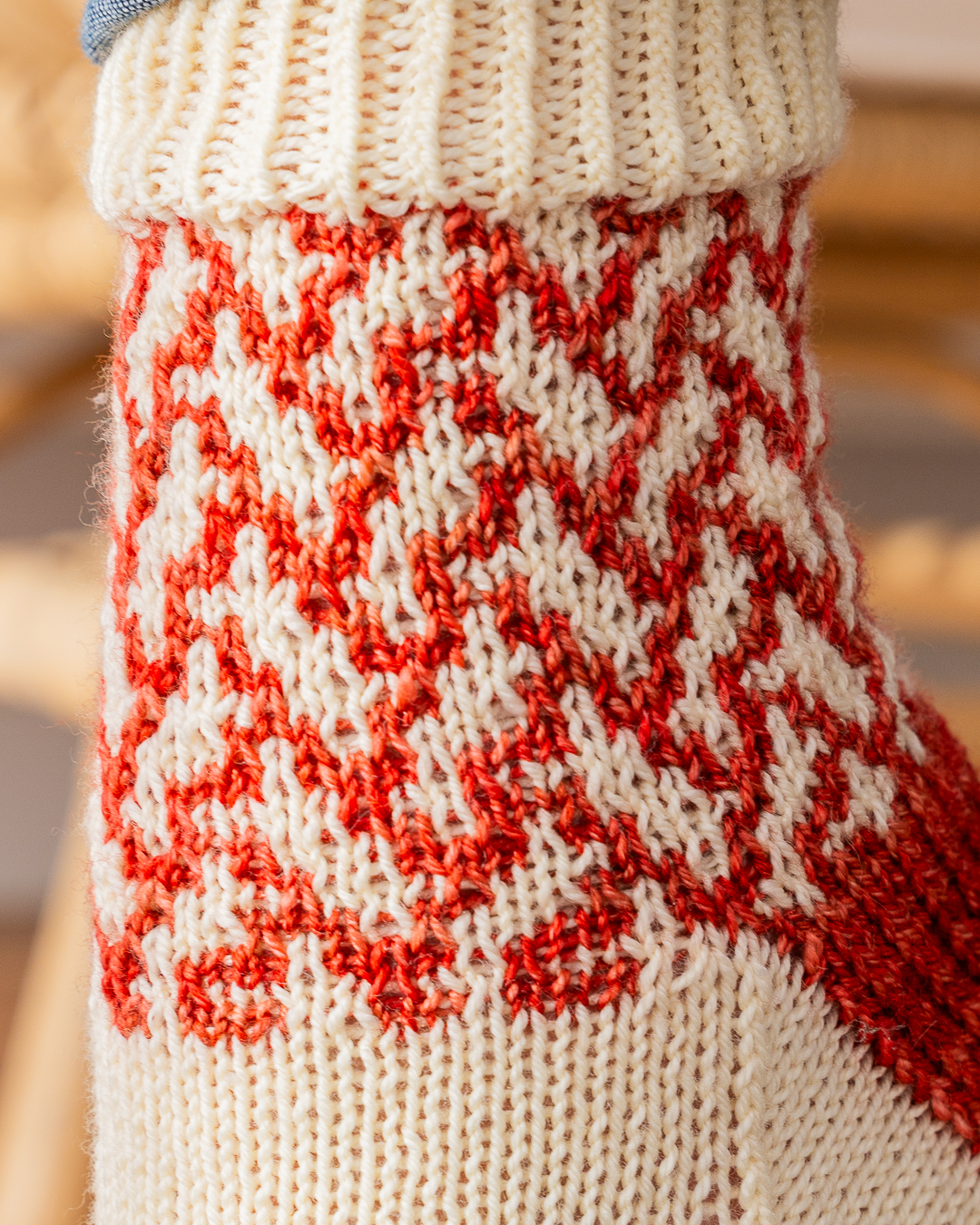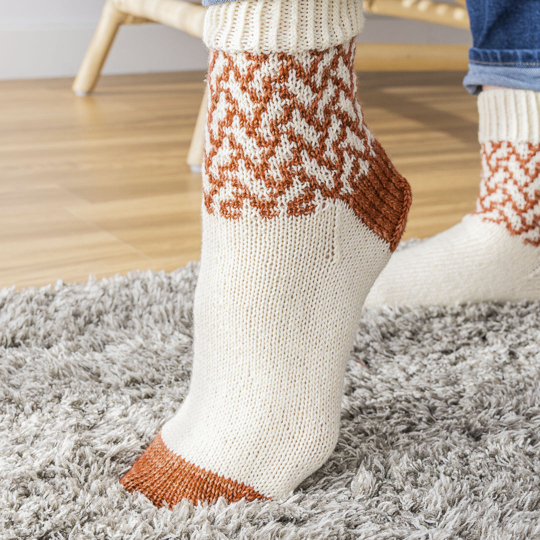 Les chaussettes Rehana sont d’élégantes chaussettes tricotées de la manchette avec la pointe avec un motif mosaïque sur toute la jambe.