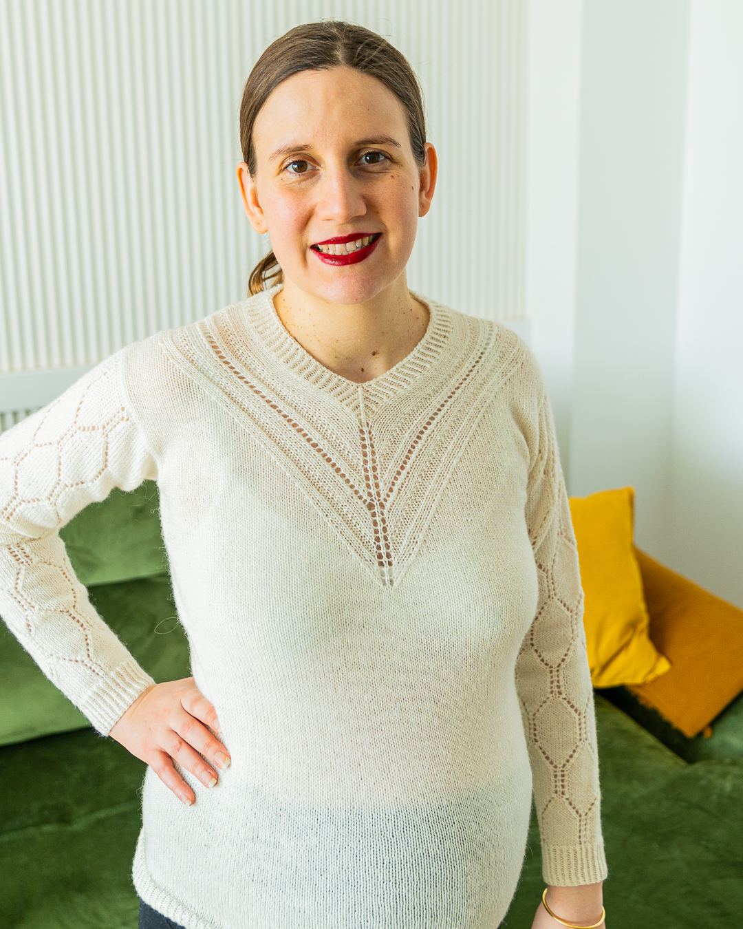 Le pull Marie Noëlle est un pull à manche droite élégant et délicat. L’encolure a été travaillé pour donner un effet “colliers empilés” ce qui le rend parfait pour venir parfaire une tenue. La dentelle sur les manches vient ajouter de l’élégance et de la légèreté à ce modèle.